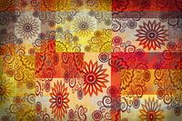 Vrolijke collage van sterren, rood en geel. Patroon. Spirograaf. Decoratieve kunst, digitaal gemaakt. Een vrolijke, zonnige collage van vormen. Overlappende vlakken.