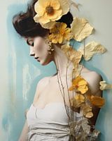 Collage: vintage portret met bloemen in geel en blauw. Kies zelf het formaat en het materiaal bij dit werk zodat het perfect in jouw interieur past.