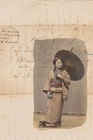 Vintage collage van oude materialen: brief, enveloppe en afbeelding van een Japanse dame in aardetinten met lichte kleuraccenten. Prachtig wanneer je deze bijvoorbeeld heel groot op doek af laat drukken.