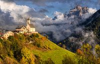 Op deze herfstfoto zien we de witte kerk van Colle Santa Lucia met daarachter de optrekkende mist uit het dal en verder op de achtergrond de hoge bergtop van Monte Pelmo in de Dolomieten.