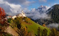 Op deze herfstfoto zien we de witte kerk van Colle Santa Lucia met daarachter de optrekkende mist uit het dal en verder op de achtergrond de hoge bergtop van Monte Pelmo in de Dolomieten.