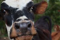 Deze koe kwam nieuwsgierig snuffelen aan de camera tijdens het fotograferen van haar kalveren in Colombia. Ze leeft in Salento, een bergdorpje in Colombia. Haar nieuwsgierigheid is prachtig op beeld gepakt, met haar diepe scherpe ogen.