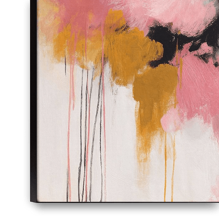 Een verfijnde abstracte schildering waarin een bloemvorm opgaat in een harmonieus samenspel van zachte roze- en goudtinten, onderbroken door dramatische zwarte accenten. Met losgeschilderde penseelstreken en druppelende verflijnen ontstaat een moderne, poëtische interpretatie van bloesem en groei—een werk dat elegantie en spontaniteit…
