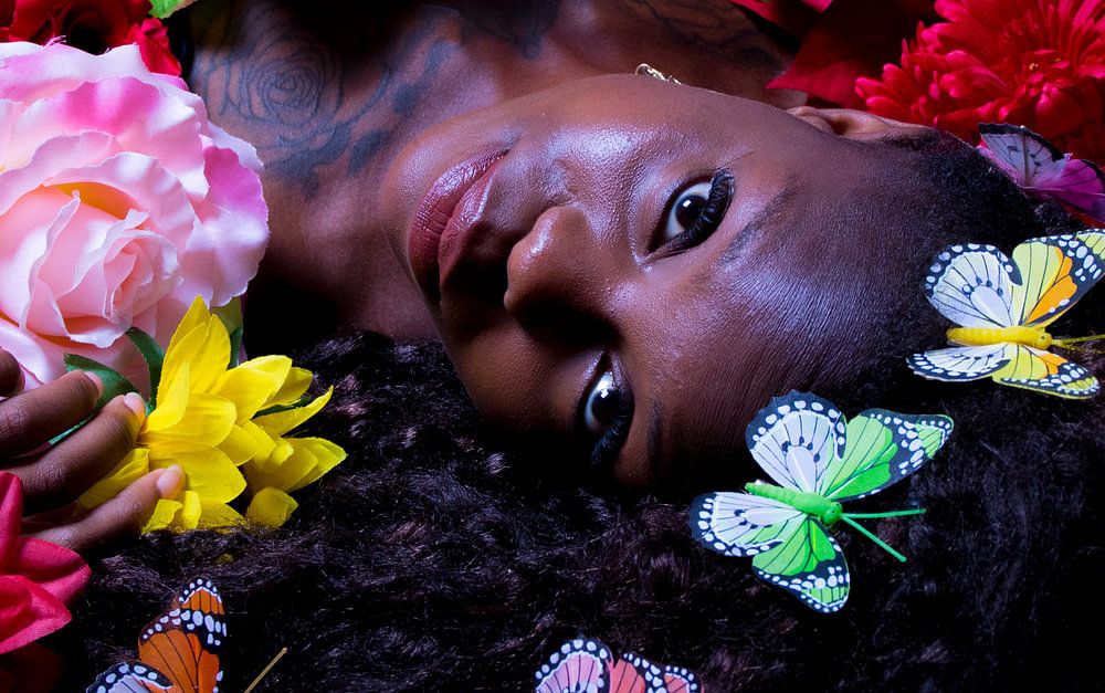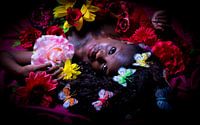 Deze donkere dame geeft een mooi contrast met de gekleurde bloemen.