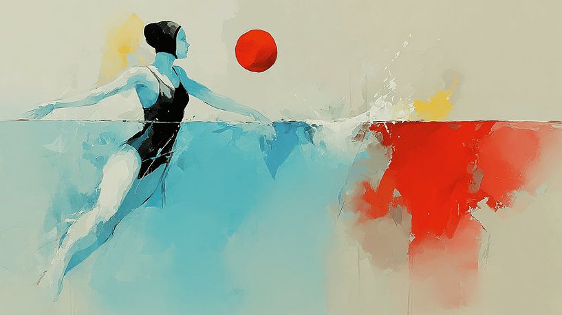 Koop dit abstracte kunstwerk Color Splash | Waterpolo Speelster met Rode Bal van Karina Brouwer als print op canvas, aluminium dibond, (ingelijste) fotoprint, behang en ArtFrame. Voor jou op maat geprint in Fine-Art kwaliteit.