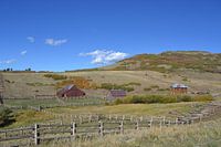 Jeeptocht door en over de bergen in de nabijheid van Ouray, Colorado, Amerika. Barn en hekwerk geven een extra accent aan het landschap.