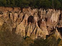 Landschapsfoto van de okerkleurige rotsen in de Colorado De L'Ocre bij Rustrel in het Luberongebergte in de Provence in het zuiden van Frankrijk op een zonnige dag in de herfst, omringd door bomen.