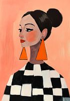 In dit schilderij is een vrouw in zijaanzicht weergegeven, met haar blik licht omhoog gericht en haar gezicht ontspannen. Haar donkere haar is samengebonden tot een knot, en aan haar oren hangen grote oranje driehoekige oorbellen. De achtergrond bestaat uit een roze vlak met zichtbare penseelstreken die de textuur van het oppervlak…