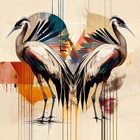 Afbeelding van kraanvogels in spiegelbeeld. Twee prachtig gekleurde vogels. In de achtergrond is gebruik gemaakt van abstracte vlakverdeling en op de voorgrond lijnen. Afbeelding op linnen. Passend bij diverse trends, waaronder Beige & Organic.