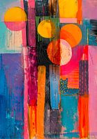 Een kleurrijk abstract kunstwerk met geometrische vormen, collage-elementen met grillige vormen en lijnen en een kleurenpalet van levendige pastels. De achtergrond is een mix van texturen die het een industriële uitstraling geven. De sfeer van de compositie is een artistieke hedendaagse kunststijl.
