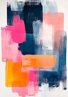Abstract kunstwerk met gedurfde penseelstreken in een kleurenpalet van roze, oranje en marineblauw op een witte achtergrond. Eenvoudige vormen creëren een minimalistische compositie.