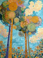 Details: bomen, bloemen, abstract, kleuren, geel, blauw, groen, oranje, paars, bruin
