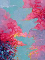 Details: abstract schilderij, kleurrijk schilderij, moderne kunst, roze, blauw, goud, speels, energie, interieur