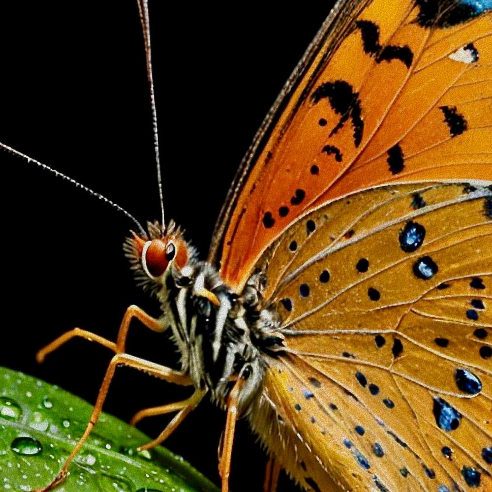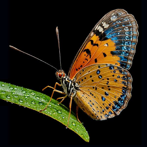 Kleurige Vlinder op groen (druppel) blad met zwarte achtergrond.