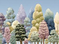 Colorful Canopy of Nature - Dit kleurrijke bomen schilderij toont een prachtig uitzicht op een bos vol met een variëteit aan bomen in verschillende vormen en levendige kleuren, waardoor het een frisse en moderne uitstraling heeft.