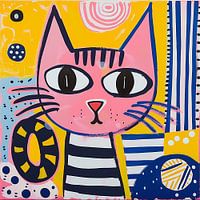 Een getekende illustratie van een roze kat. De kleuren zijn lichtgeel en indigo en geïnspireerd lijkt te zijn door volkskunst. De illustratie bevat kenmerkende elementen zoals strepen en vormen, die een dynamisch en levendig geheel creëren.