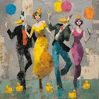 Colorful Celebration with Friends - Dit feestelijke schilderij toont een vrouw in een opvallende gele jurk en mensen met dierenmaskers, die vrolijk dansen en ballonnen vasthouden, terwijl gele eendjes aan hun voeten drijven in een speelse setting.