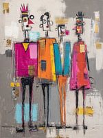 Colorful Character Crew - Dit kleurrijke moderne kunst schilderij toont een groep vier mensen met opvallende gezichten en kleding, waarbij de combinatie van felroze, oranje en turquoise de aandacht trekt en een vrolijke sfeer oproept.