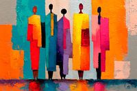 Een kleurrijk abstract kunstwerk met vijf gestileerde figuren naast elkaar. Elk figuur is opgebouwd uit geometrische vormen en is gekleed in levendige opvallende kleuren. De achtergrond is een mix van textuurtinten wat een dynamisch contrast creëert. De figuren hebben eenvoudige, ronde hoofden en langgerekte lichamen, wat hun abstracte karakter benadrukt. De algehele compositie is levendig en expressief en straalt een gevoel van eenheid en diversiteit uit.