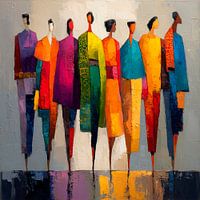 Een levendig, abstract kunstwerk met gestileerde figuren op een rij. De figuren worden gekenmerkt door hun langgerekte vormen en minimalistische gelaatstrekken, waardoor hun houdingen en kleding meer worden benadrukt dan hun individuele identiteit. De achtergrond bestaat uit een gradiënt van neutrale tinten, waardoor de heldere tinten…