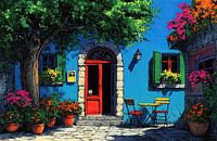 Colorful Door - Dit schilderij toont een levendig tafereel van een kleurrijke gevel met een felrode deur, omlijst door groene shutters en bloeiende bloemen in potten, wat het geheel een vrolijke en uitnodigende uitstraling geeft in een schilderstijl die aan impressionisme doet denken.