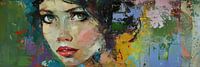 Colorful Embrace of Solitude - Dit vrouwen schilderij toont het dramatische en emotioneel geladen portret van een jonge vrouw, uitgebeeld met een levendige en dynamische stijl, wat kenmerkend is voor moderne expressieve kunst. Het gezicht van de vrouw, centraal in het doek, trekt onmiddellijk de aandacht met grote, doordringende ogen die schijnbaar rechtstreeks tot de toeschouwer spreken. Haar ogen zijn gedetailleerd met hints van groen en grijs, waardoor een diepte ontstaat die de intensiteit van haar blik versterkt. Haar huid is een veelzijdig palet van crèmes, beige, en rozige tinten, fragmentarisch overschilderd met levendige kleuren die emotie en beweging suggereren.