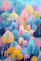 Details: bomen, kleurrijk, blauw, geel, roze, bos, pastel, modern, vrolijk, decoratie