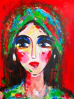 Haar haar is een kleurrijke chaos—een regenboogexplosie die zegt: “ik ben niet te temmen, darling”. De rode achtergrond schreeuwt passie, vuur en temperament. Denk flamenco op een vulkaan.