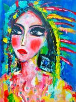 Ze kijkt schuin opzij. Alsof ze net iets weet wat jij nog niet weet. Alsof ze je geheimen ruikt van een halve meter afstand. En toch… wil je weten wie ze is. Deze vrouw is vuurwerk op canvas. Een kruising tussen een tropische storm en een felle regenboog die geen zin had om netjes binnen de lijntjes te blijven.