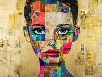 Details: vrouw, portret, veelkleurig, goud, beige, abstract, gezicht, blokjes, moderne kunst, diversiteit