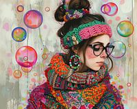 Colorful Reverie - Dit vrouwen schilderij toont een dromerige dame omringd door kleurrijke zwevende zeepbellen, gehuld in een levendig gebreide sjaal en muts.