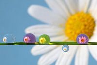 Druppelfoto met een haarscherpe weerspiegeling van een witte Margriet in een waterdruppel. Een waterdruppel werkt als een lens en weerspiegelt wat zich achter de druppel bevindt. In dit geval bevindt de witte Margriet zich achter de druppels, de Margriet wordt haarscherp en gekleurd weerspiegeld en vormt een intrigerend en surrealistisch beeld. Pure fotografie en geen fotobewerking! Voor meer druppelfoto's zie mijn website: www.reflections-by-inge.com