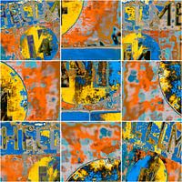Een abstract en kleurrijke collage. De kleuren knallen je tegemoet. Vaag zijn nog de contouren van het onderwerp zichtbaar. Maar slechts in onderdelen, nooit het geheel.