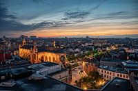 Brussels city center, Belgium, July 20 , 2023 - Colorful sunset over old town with the Saint Catherine church and rooftops