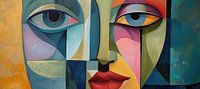 Colors of Her Complexity - Dit abstracte vrouwenschilderij toont een intrigerend en kleurrijk portret van een dame, opgesteld in een stijl die doet denken aan het kubisme waarin de realiteit is opgebroken in abstracte, geometrische componenten. De afbeelding bestaat uit veelhoekige vlakken die de vormen van het gezicht vertegenwoordigen: een scherp gevormde neus, markante wangen, volle rode lippen en twee diepliggende ogen die de toeschouwer indringend aankijken. De rechteroog is prominent blauw met een zwarte pupil, omkaderd door accenten van lichtroze en donkerblauw, terwijl het linkeroog verborgen is achter vlakken van zachte roze en blauwtinten. Dit kubistisch vrouwenschilderij maakt gebruik van een dynamisch kleurenpalet met tinten die variëren van diepblauw en zeegroen tot zachte rozes, felrood en goudgeel, waardoor het een visueel stimulerende ervaring biedt. Elk segment van het gezicht is zorgvuldig getint en schaduwen zijn strategisch aangebracht om diepte te verlenen, waardoor het kunstwerk een driedimensionaal effect krijgt. Dit maakt het abstract vrouwenschilderij niet alleen een visueel spektakel maar ook een studie van de emotionele expressie verpakt in een kubistische stijl.