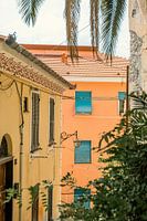 mooie zachte zomerkleuren van de huizen aan de Ligurische kust in Italië. Door kijkje op de gekleurde huizen met nog wat groen op de voorgrond. Warme gele en oranje tinten. Gemaakt in het plaatsje Deiva Marina.