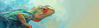 Colorshift Mystic - Dit kameleonschilderij presenteert een visueel verbluffende weergave van een levensecht kameleon, opgesteld tegen een achtergrond die lijkt te bestaan uit een werveling van lichte en etherische kleuren. Het reptiel is te zien in glorieuze detail, waarbij elke schub zichtbaar is en badend in een spectaculair palet dat varieert van groen, blauw, oranje tot geel. Deze kleuren lijken haast te flikkeren en veranderen, wat het adaptieve vermogen van het dier benadrukt. De achtergrond contrasteert, maar complementair aan het dier, met een zachtere en minder gedefinieerde mix van lichte blauwe en witte tinten, en suggereren een onscherpe, dromerige atmosfeer. Het detail en de textuur in de penseelstroken geven het beeld een bijna tastbare kwaliteit. Dit schilderij slaagt erin de essentie van dit fascinerende wezen vast te leggen, waardoor het een levendige en dynamische indruk achterlaat.