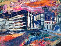 De warme tinten contrasteren met koelere accenten, wat zorgt voor diepte en een gevoel van gelaagdheid. De speelse compositie vangt de energie van het stadsleven zonder letterlijk te worden — perfect voor wie houdt van moderne kunst met karakter.