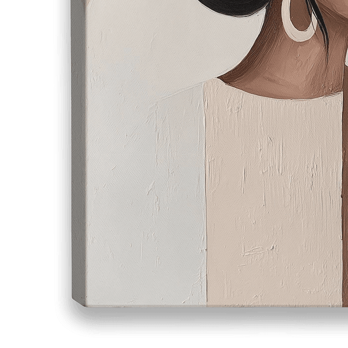 Een modern abstract schilderij van een vrouwelijk portret in beige, grijze tinten. Minimalistisch, maar ook een blikvanger. Past mooi in een rustig interieur, of in een kleurrijk interieur om meer rust toe te voegen.
