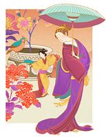 Een vrolijke, kleurrijke collage van digitaal gemoderniseerde vintage Japanse afbeeldingen.