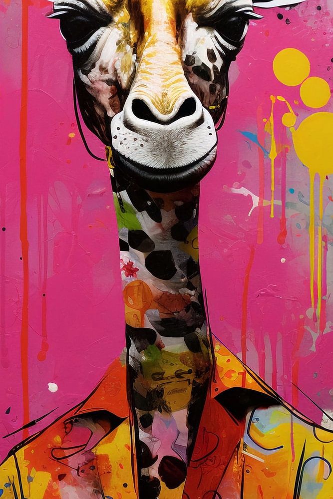 Een kleurrijke afbeelding anthropomorfische giraffe in een pak met verfspatten en druipende verf. Een giraffe met menselijke trekjes. Dit werkstuk is gemaakt in samenwerking met kunstmatige intelligentie.