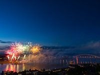 De vuurwerkshow van de Vierdaagse feesten van Nijmegen. Tijdens dit jaarlijks terugkerende evenement is er een gote vuurwerkshow op de rivier de Waal. Het vuurwerk wordt elk jaar vanaf een ponton afgestoken. Dit ponton ligt tussen de waalbrug en de spoorbrug. Op deze manier kunnen mensen vanaf de Lentse zijde en de Nijmeegse zijde het vuurwerk mooi zien. Deze foto is gemaakt vanaf toren van de grote of st Stevenskerk.