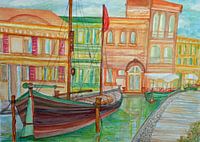 Comacchio in de Podelta, ook wel Klein Venetië genoemd, met zijn vele kanalen, kleurrijke huizen en boten, vastgelegd in aquarel.