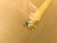 Maaidorser die tarwe oogst op een goudkleurig veld in de zomer, van bovenaf gezien. Er komt stof van de oogstmachine tijdens deze periode van droogte.