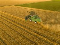 Maaidorser die tarwe oogst op een goudkleurig veld in de zomer, van bovenaf gezien. Er komt stof van de oogstmachine tijdens deze periode van droogte.