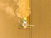 Maaidorser die tarwe oogst op een goudkleurig veld in de zomer, van bovenaf gezien. Er komt stof van de oogstmachine tijdens deze periode van droogte.