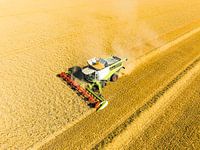 Combine of maaidorser oogst tarwe in een goudkleurig veld tijdens de zomer, van bovenaf gezien. Er komt stof van de oogstmachine tijdens deze periode van droogte.