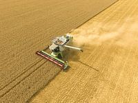 Combine maaidorser die tarwe oogst tijdens een zomerse zonsondergang van bovenaf gezien. Er komt stof van de maaidorser tijdens deze periode van droogte.