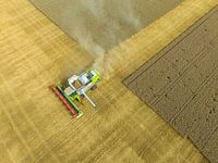 Maaidorser die tarwe oogst op een goudkleurig veld in de zomer, van bovenaf gezien. Er komt stof van de oogstmachine tijdens deze periode van droogte.
