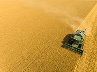 Combine maaidorser die tarwe oogst op een goudkleurig veld tijdens de zomer, van bovenaf gezien. Er komt stof van de oogstmachine tijdens deze periode van droogte.